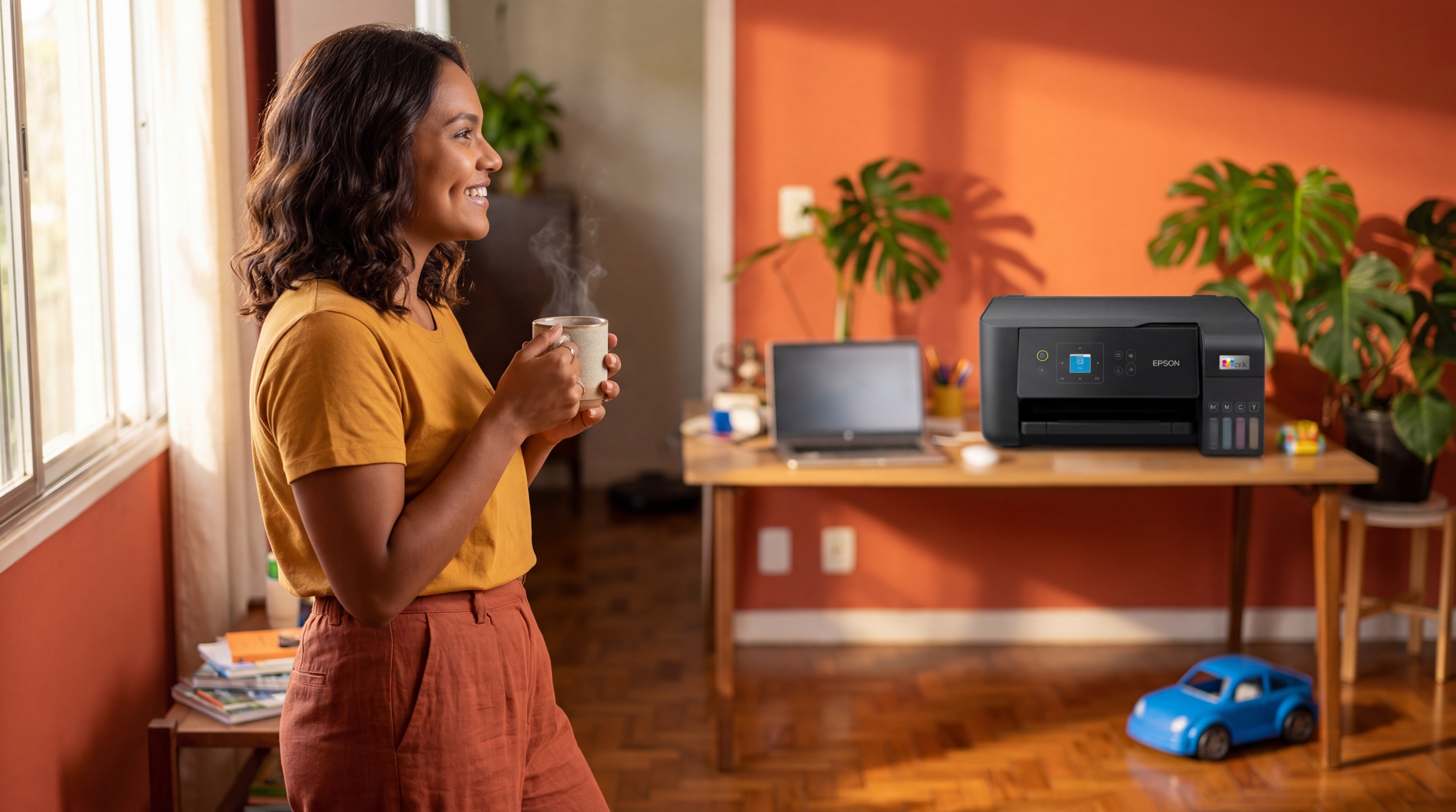 Photograph of Luciana Oliveira standing by a sun-drenched window in her vibrant Brazilian home office, holding a steaming ceramic mug with both hands. She has a bright, expectant smile revealing deep cheek dimples, looking out at the morning sun with fresh energy. She wears a mustard-yellow t-shirt and terracotta linen trousers. In the soft-focus background, a wooden desk holds a laptop and a black Epson EcoTank L3560 printer with its signature translucent ink windows on the right. The room features high-saturation terracotta walls, a lush green Monstera plant, and a small blue toy car on the hardwood floor. Medium shot, side profile, captured on Fujifilm X-T5 with a 35mm f/1.4 lens, featuring warm golden-hour lighting, shallow depth of field, and rich, natural textures. 4k resolution, photorealistic.