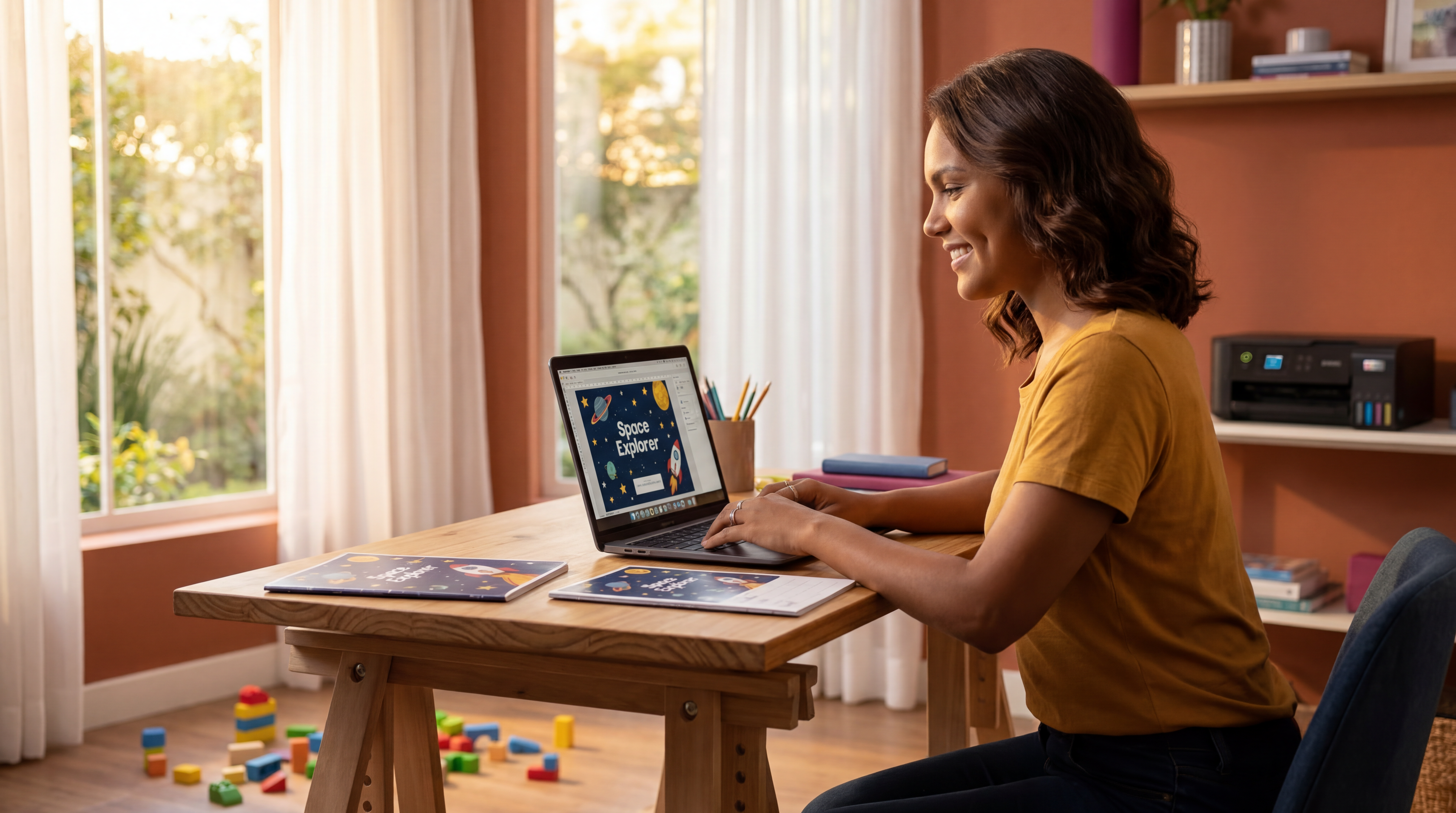 Photograph Luciana Oliveira, a 34-year-old Brazilian woman with warm golden skin and chestnut bobbed hair, sitting at her wooden trestle desk in her terracotta-walled home office. She leans toward her laptop with a bright, focused smile and deep dimples, designing vibrant "Space Explorer" school covers featuring stars and rockets. To her right, a large window with soft white curtains lets in warm, golden Brazilian morning light. In the soft-focus background, the black Epson EcoTank L3560 sits ready on a shelf, its cyan and magenta ink levels visible through front windows. A few scattered colorful building blocks on the floor add a lived-in family touch. Medium profile shot, crisp detail on her mustard-yellow t-shirt and the desk's wood grain. Captured on Fujifilm X-T5, 35mm f/1.4, lifestyle photography with Quartz blue and magenta accents in the décor, high-key natural lighting.