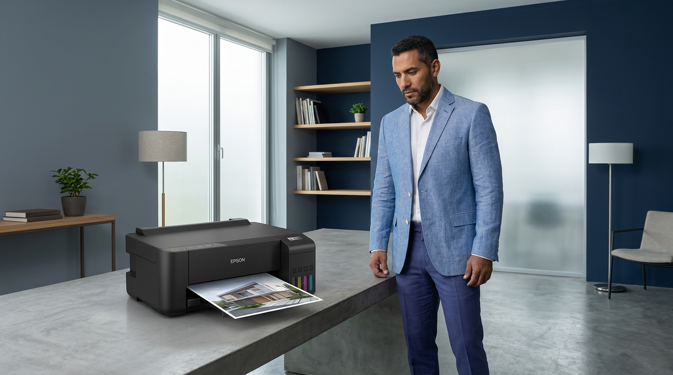 A wide-angle, eye-level lifestyle shot in a minimalist Uruguayan home office. Andrés Castaño, a 41-year-old Colombian man with a solid athletic build, salt-and-pepper cropped hair, and striking amber eyes, stands by a large concrete desk. He is wearing a structured light blue linen blazer and tailored trousers. On the desk sits the Epson EcoTank L1250 printer in matte black, with its translucent ink tanks visible on the right. Andrés is looking at a high-quality architectural render that has just emerged from the front output tray. The room is bathed in the soft, diffused light of an overcast Montevideo afternoon, creating deep, soft shadows. The walls are a cool slate gray, with a single Epson Navy accent wall in the background. The composition is clean and geometric, emphasizing the stillness of the moment.