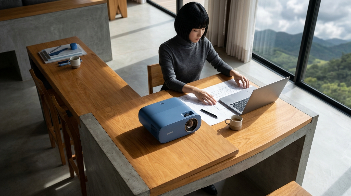 High-angle, overhead flat lay photography of a professional creative workspace inside a modern Brazilian mountain cabin. Centered on a heavy table made of warm, honey-toned freijó wood and raw gray concrete, the blue Epson EpiqVision Pop Plus EF62 portable projector sits prominently, its matte cylindrical form and precision lens catching the crisp morning light. Aiko Tanaka, a 25-year-old Japanese architectural designer with a razor-sharp black bob and porcelain skin, is seen from above, her slender hands meticulously aligning a set of architectural blueprints next to a sleek, minimalist laptop. She wears a structured charcoal grey wool turtleneck, embodying a disciplined and analytical energy. The scene is bathed in soft, natural light from a large floor-to-ceiling window, creating clean, sharp shadows that emphasize the 'Linearity' of her style. Subtle accents of Quartz Blue and Epson Navy appear in the design tools on the table. The composition is balanced and uncluttered, capturing a moment of quiet, focused preparation. 8k UHD, photorealistic, professional DSLR quality, sharp focus on the projector's texture and the wood grain.