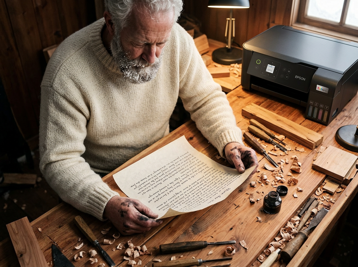 Capture a high-angle top-down shot of a young, 28-year-old Papá Noel with a robust build and a thick snowy beard, industriously reviewing a long hand-written parchment scroll. He is dressed in a heavy cream wool sweater, his hands resting on a rustic cedar workbench scattered with iron carving tools and wood shavings. In the background, resting naturally on the edge of the workbench, sit an Epson EcoTank L3560 premium printer in matte black, showing its distinct right-side ink tanks and top ADF. The scene blends a cozy North Pole workshop with Uruguayan minimalist aesthetics, using a palette of muted neutrals, soft whites, and a touch of Epson Navy in the shadows. Lighting is a mix of warm tungsten glow from a desk lamp and soft, diffused overcast light from a nearby window. Photorealistic, Phase One IQ4, 35mm f/2.8, sharp focus on the textures of the scroll and wood, soft bokeh on the printer behind him.