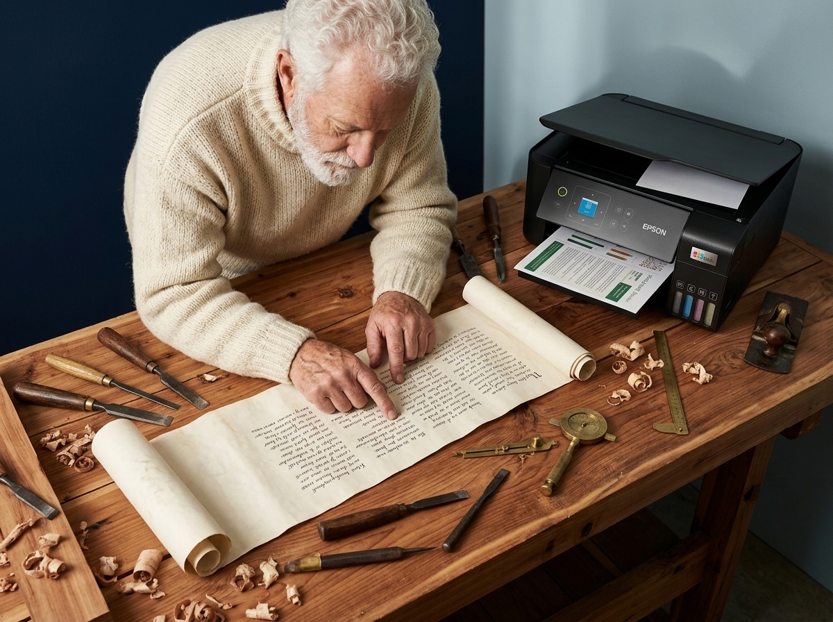 Capture a high-angle top-down lifestyle shot of a 28-year-old Papá Noel with a thick snowy beard and cerulean eyes, dressed in a heavy cream wool sweater, as he leans over a rustic cedar workbench. His weathered hands are carefully reviewing a long, hand-written parchment scroll that unfurls across the wooden surface amidst neatly arranged iron woodworking tools and wood shavings. In the background corner of the desk, the Epson EcoTank L3560 printer sits in a matte black finish, its right-side ink tanks and top ADF tray reflecting a warm tungsten glow. The scene is anchored by deep Epson Navy shadows and soft Quartz Cyan highlights on the workshop wall. The lighting is diffuse and atmospheric, following an Uruguayan minimalist aesthetic with muted earth tones and a contemplative mood. Captured on a Phase One IQ4, 45mm f/2.8, with sharp focus on the textures of the scroll and the wool of the sleeves.
