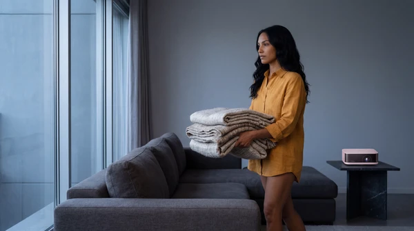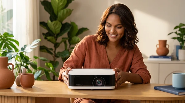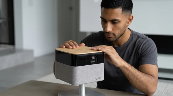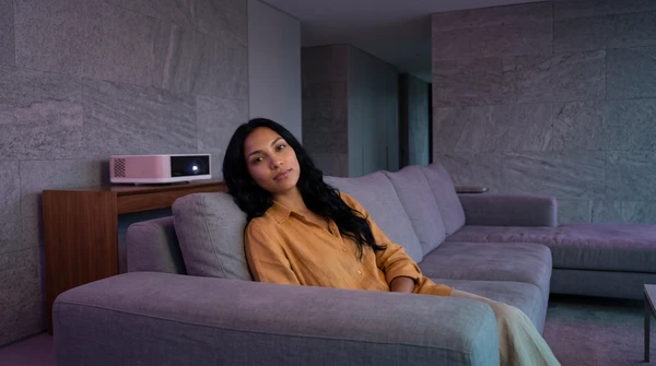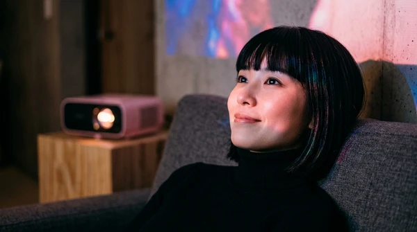 Lucía usando el EpiqVision Mini para ver un partido en la terraza