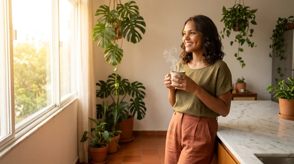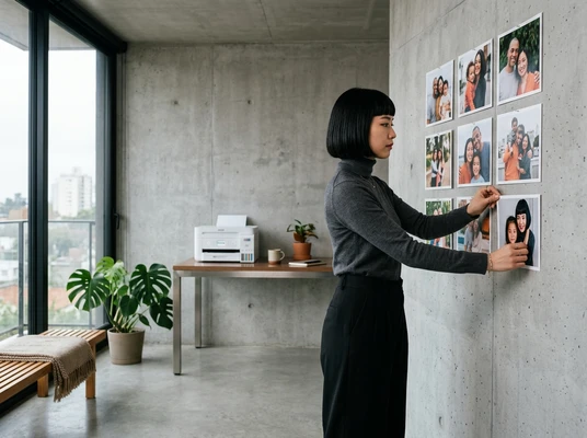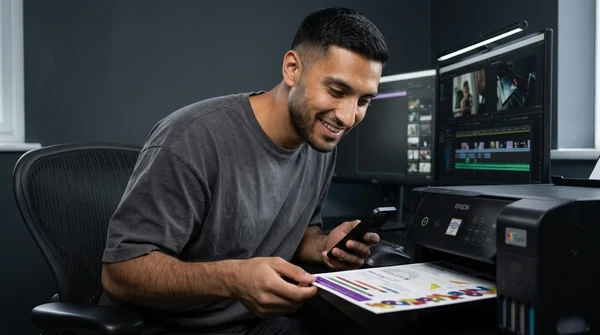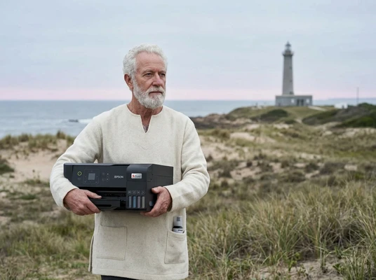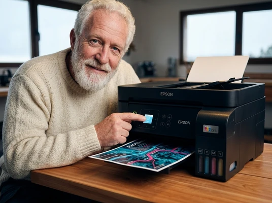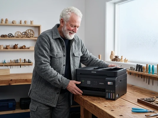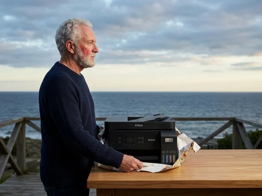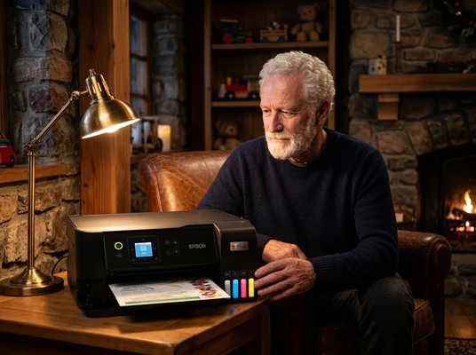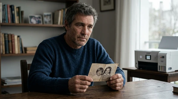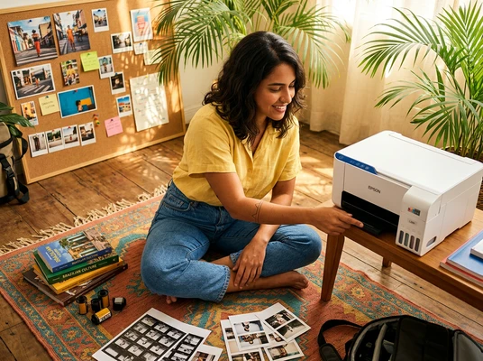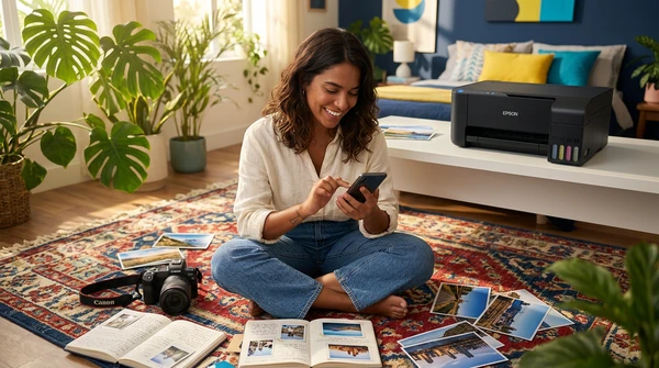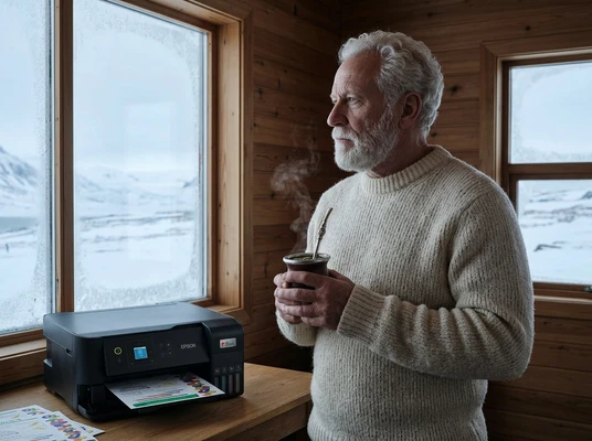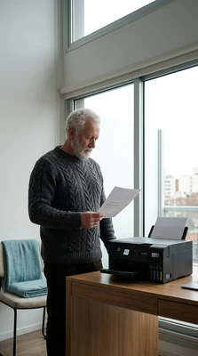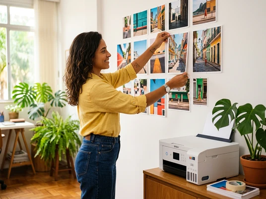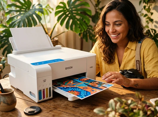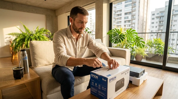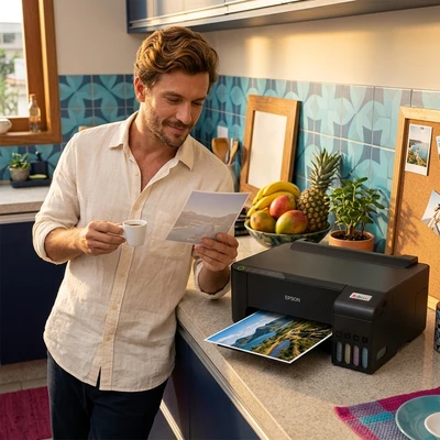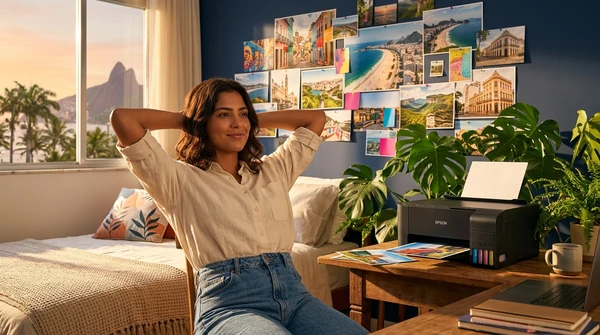 Carlos tomando un espresso mientras mira las fotos de su viaje que acaba de imprimir. Cocina brasileña con azulejos y frutas tropicales. La impresora EcoTank L1250 sobre la mesada, una foto de paisaje saliendo de la bandeja frontal. Luz dorada de tarde.