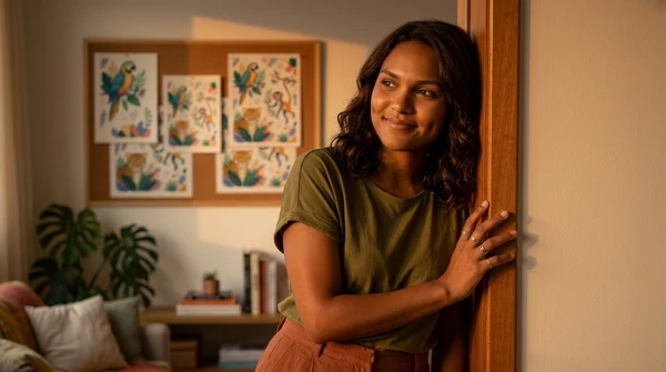 Professional editorial photograph in a cozy home studio. Luciana interacting with the EF61, soft diffused afternoon light. Captured with Sony A7IV, 50mm f/1.8, Kodak Portra 400 film simulation.