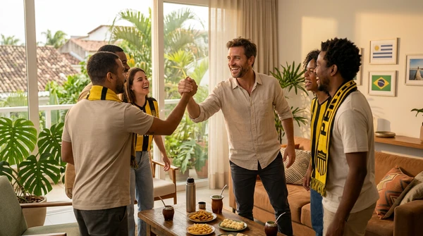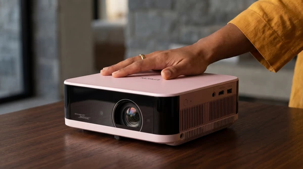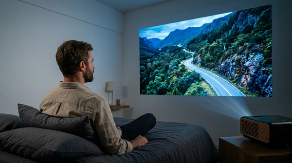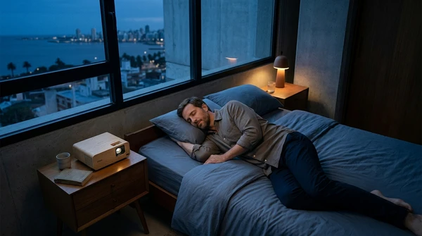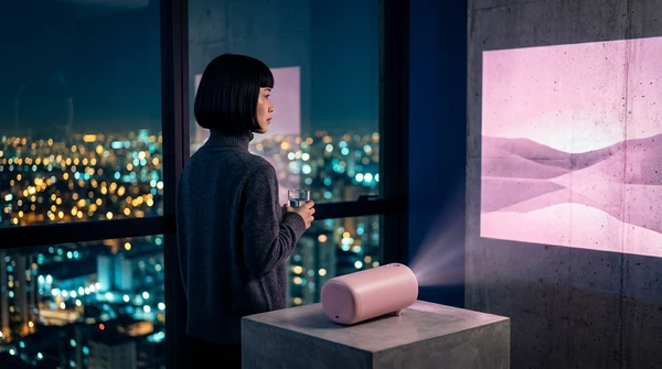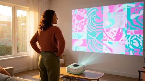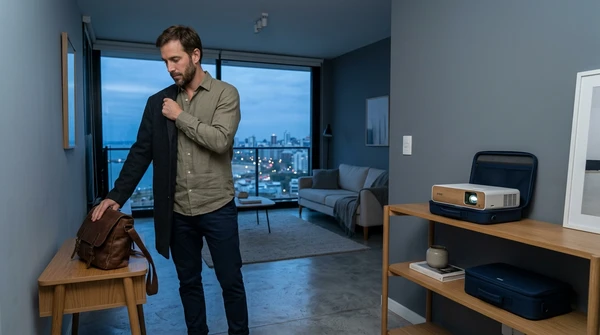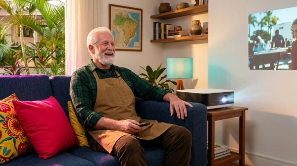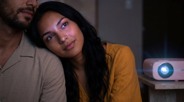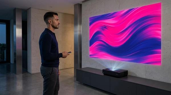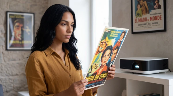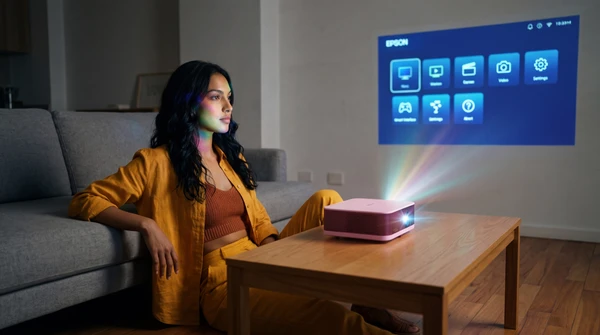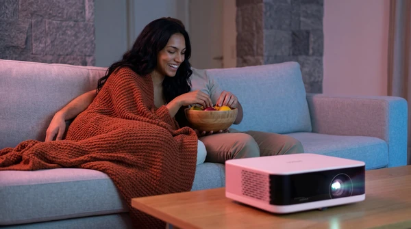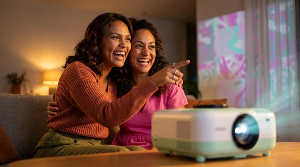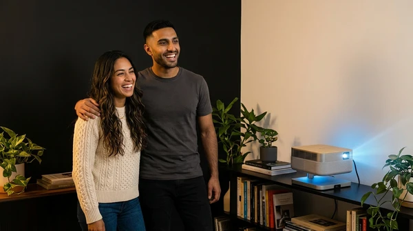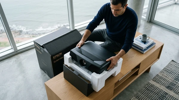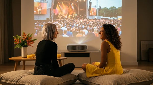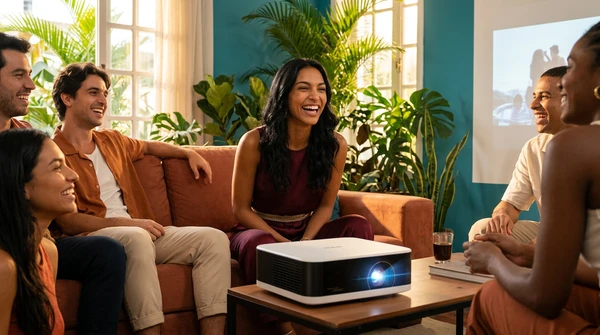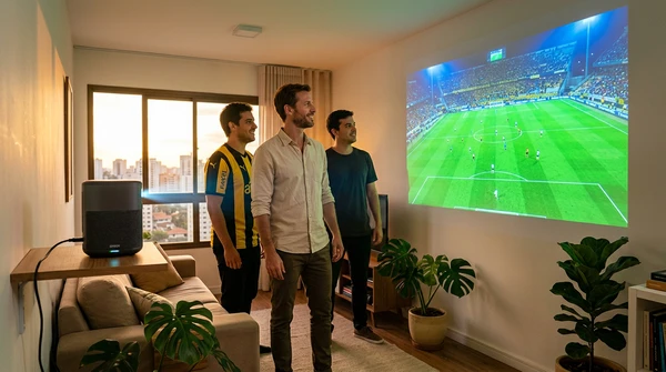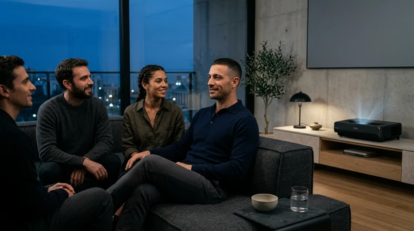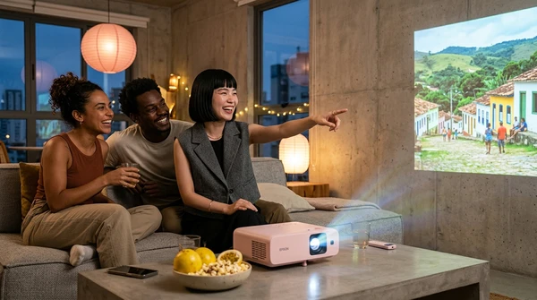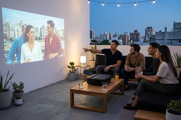 Marco tiene tres amigos en su apartamento de Montevideo para una noche de cine. El EpiqVision LS670 proyecta una película italiana en la pared blanca. Sofá amplio, luces tenues, copas de vino. El proyector ultra corta distancia a apenas 20cm de la pared, plano en el mueble de TV.