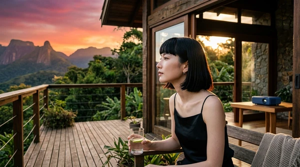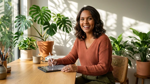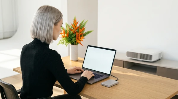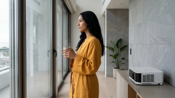 Lifestyle photo of Luciana Oliveira using the EpiqVision Pop EF61 in a bright, modern home office with warm afternoon light streaming through large windows.
