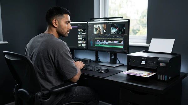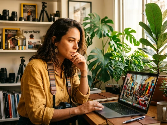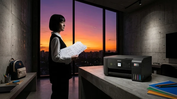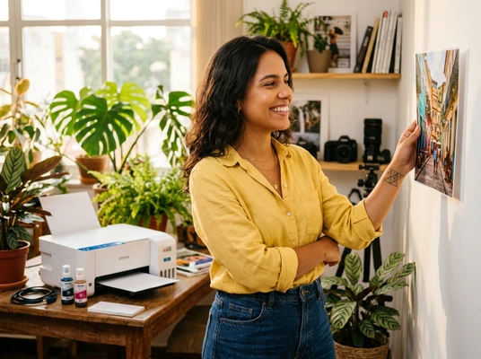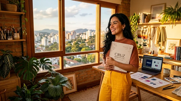 Valentina en su estudio de diseño, imprimiendo bocetos para su emprendimiento creativo. Mood urbano moderno, colores profundos, ciudad de fondo a través de ventana grande.