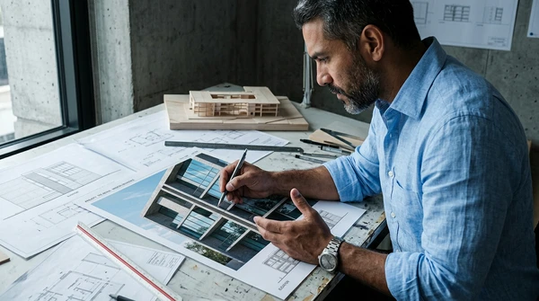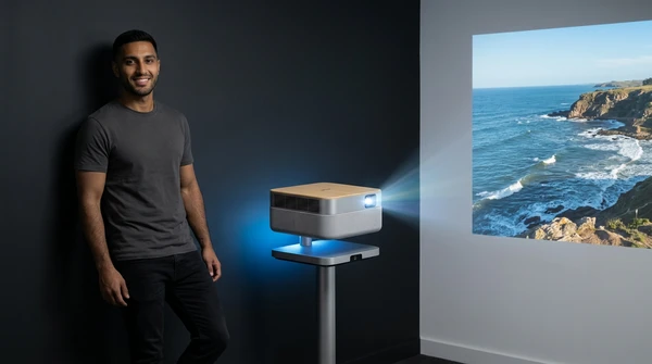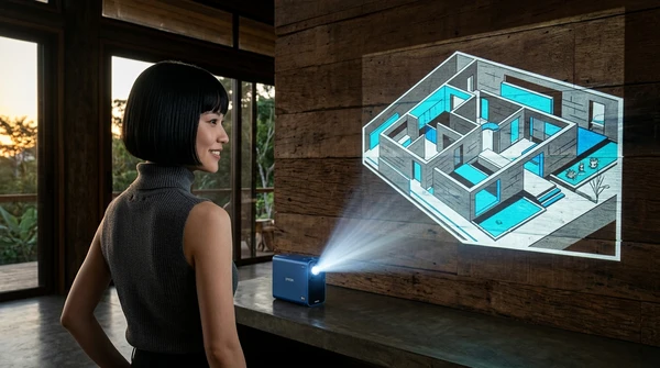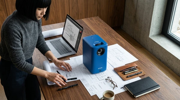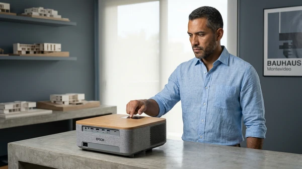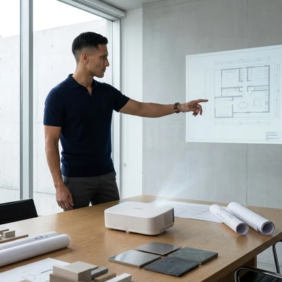 Marco usa el EpiqVision Pop EF61 para presentar un proyecto arquitectónico a un cliente en una reunión informal en su estudio. Proyector apoyado en la mesa de reunión, imagen nítida en la pared. Ambiente profesional moderno, planos y muestras de materiales sobre la mesa. Marco de pie señalando la proyección con confianza.