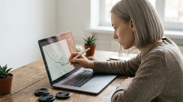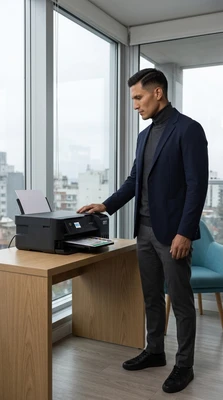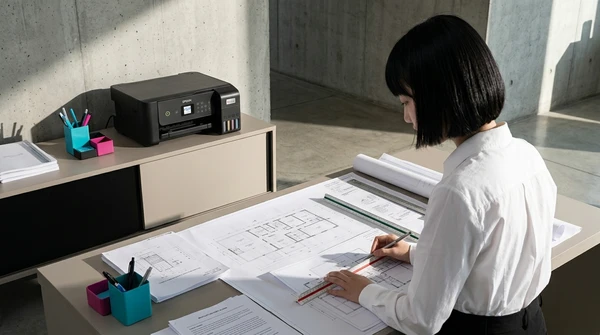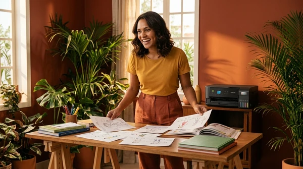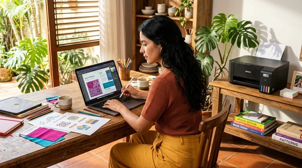 Valentina en su estudio de diseño imprimiendo bocetos