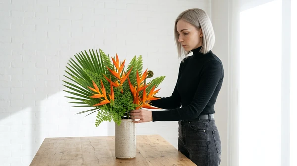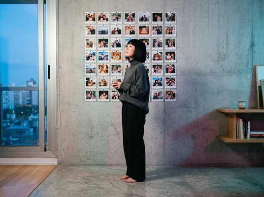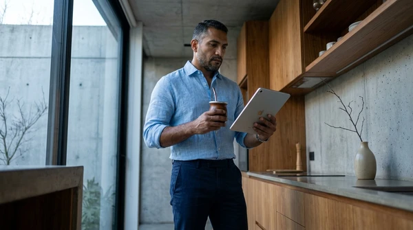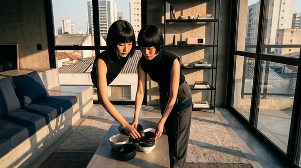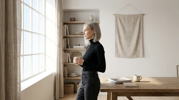 Minimalist apartment, person using product near a large window
