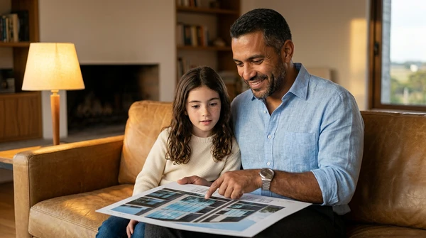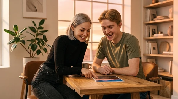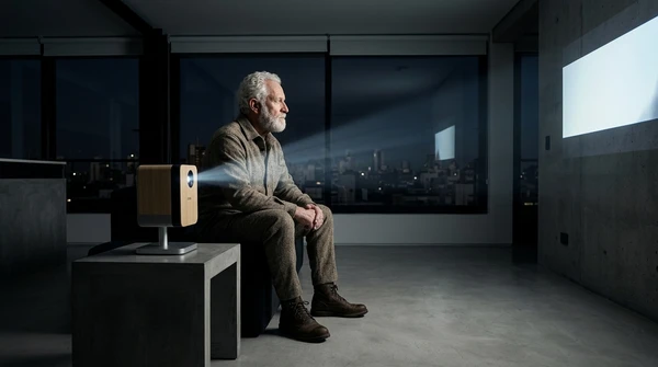 Professional editorial photograph in a cozy home studio. Andrés interacting with the EF72, soft diffused afternoon light. Captured with Sony A7IV, 50mm f/1.8, Kodak Portra 400 film simulation.
