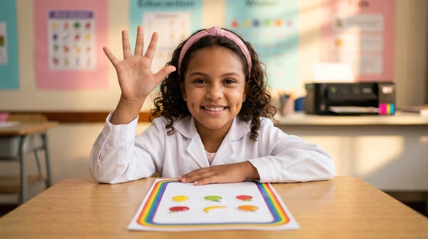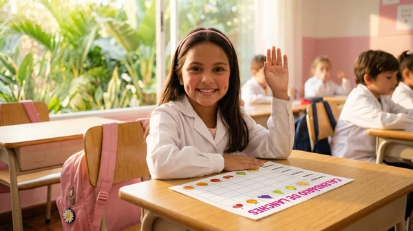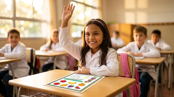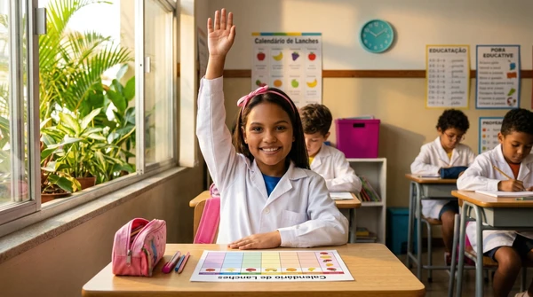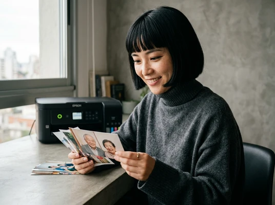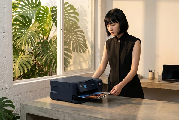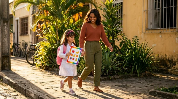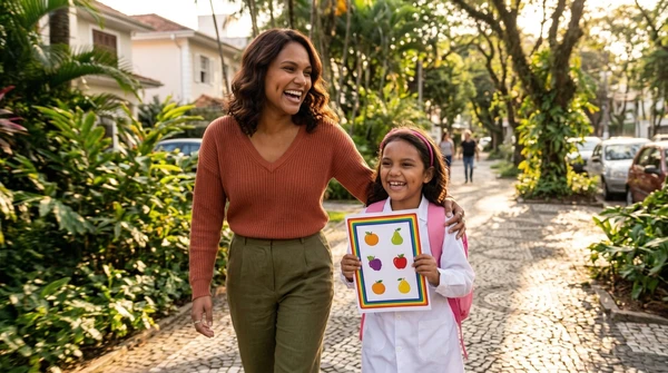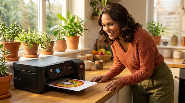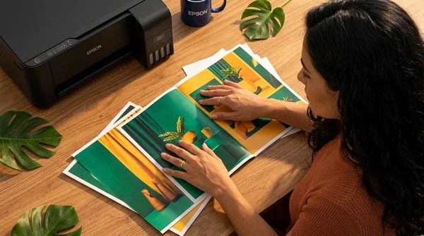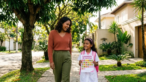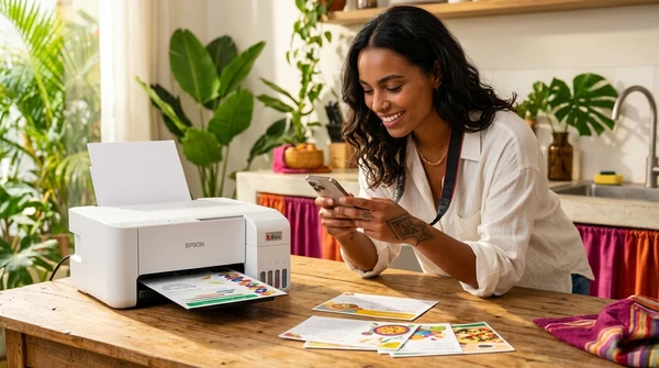 Lucía toma fotos de las impresiones de recetas que acaba de sacar de su impresora en su cocina luminosa. Ambiente brasileño cálido, luz de mañana, colores vibrantes. Producto visible en el fondo.