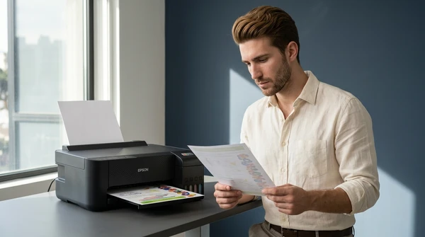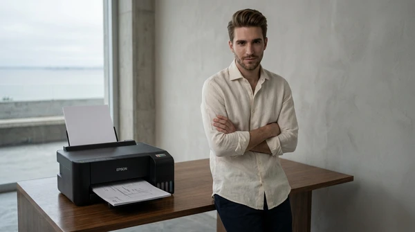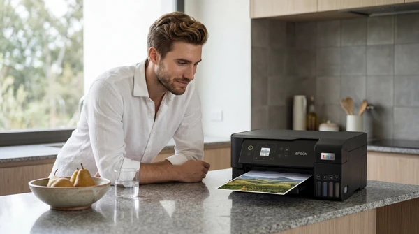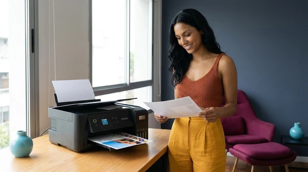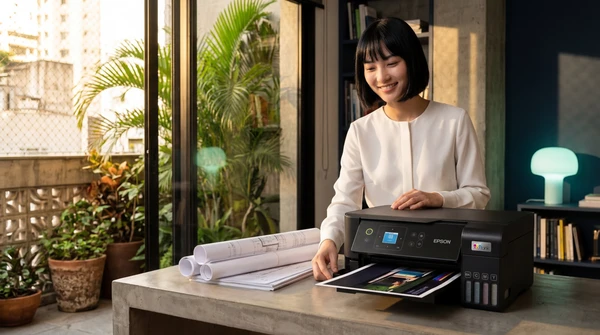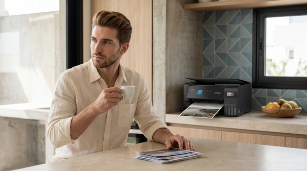 Lifestyle photo of a young professional using the EcoTank L3560 in a bright home office.