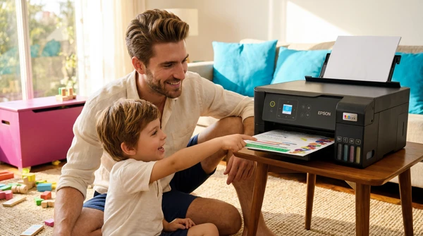 Carlos y su hijo pequeño imprimen los dibujos del niño con el EcoTank en la sala de su casa en Montevideo. El niño señala emocionado la hoja que sale de la impresora. Tarde de domingo, luz cálida, juguetes visibles en el fondo. Momento íntimo familiar.