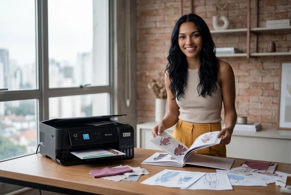 Valentina en su estudio de diseño urbano en São Paulo, imprimiendo el primer catálogo físico de su marca de moda con el EcoTank L3560. Pared de ladrillo expuesto, luz filtrada, hojas recién impresas sobre la mesa junto a muestras de tela y bocetos. Mood emprendedora creativa.